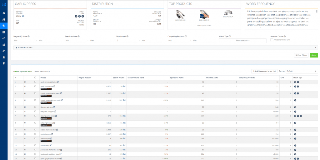 Pojdite na svoj Helium10 račun ter na levi izberite orodje Magnet. Vpišite neko ključno besedo, recimo »garlic press« ter vključite filter »najmanj 1000 IQ score« in »najmanj 500 exact search«. Kar vam prikaže, so ključne besede, ki jih Helium10 smatra kot dobro priložnost.