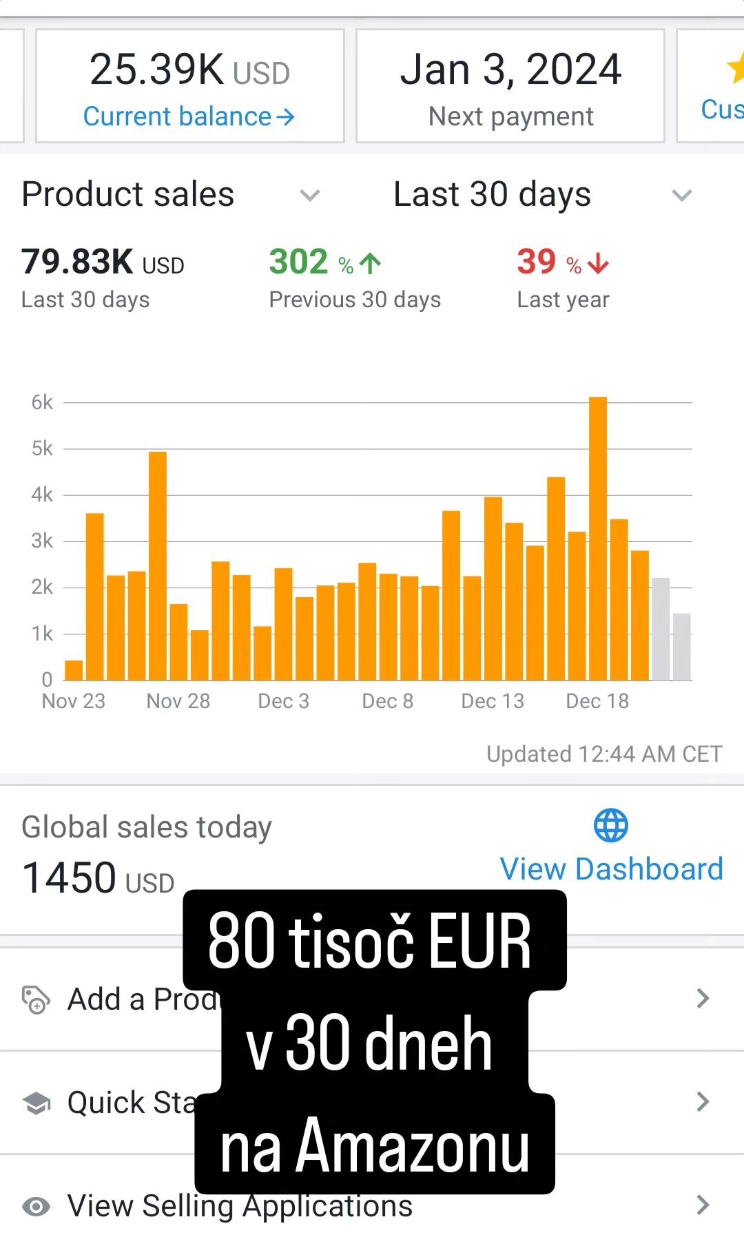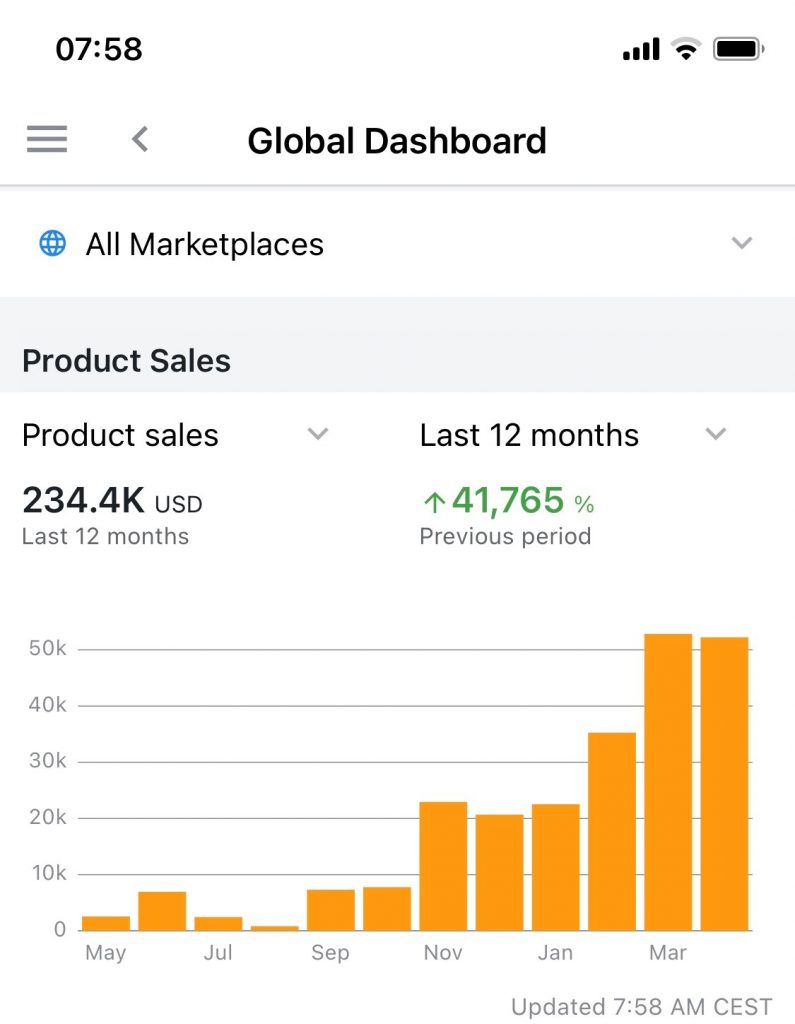 Konkretni rezultati prodaje izdelkov na Amazonu enega od naših kupcev Amazon paketa. Kot vidite na fotografiji spodaj ima kupec Amazon paketa že več kot 50 tisoč prihodka na mesec s prodajo izdelkov.