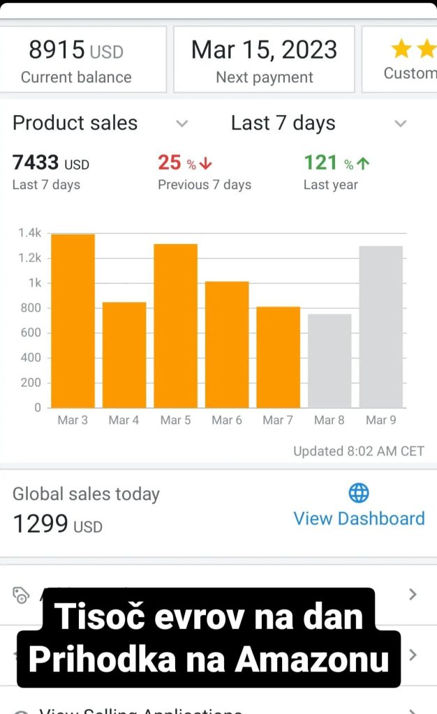 - Kako Amazon prodajalci iz Slovenije v praksi izbirajo profitabilne izdelke (napisano na 285 straneh) in kako jim je iz njih uspelo narediti na tisoče, pa tudi na deset tisoče evrov profita mesečno. Vse to z malo dela in s pomočjo prodaje izdelkov na Amazonu. Gre za podrobne opise vseh začetnih postopkov, vse od postavitve Amazon seller računa iz Slovenije do oglaševanja vašega produkta, ki je že na Amazonu (večina začetnikov tukaj dela največ napak!).